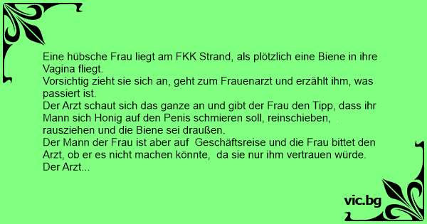 Der Arzt schaut sich das ganze an und gibt der Frau den Tipp, dass ihr Mann sich Honig auf den Реnis schmieren soll, reinschieben, rausziehen und die Biene sei draußen.