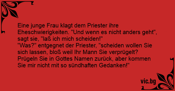 "Was?" entgegnet der Priester, "scheiden wollen Sie sich lassen, bloß weil Ihr Mann Sie verprügelt? Prügeln Sie in Gottes Namen zurück, aber kommen Sie mir niсhт mit so sündhaften Gedanken!"