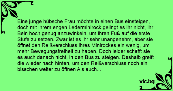 Er staat bij de bushalte een lange wachtrij. Vooraan staat een mooie meid in een aardig krap mini rokje. Dan verschijnt eindelijk de bus. Als die mooie meid in wil stappen, krijgt ze haar been niet...