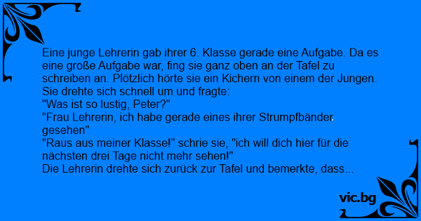 Eine junge Lehrerin gab ihrer 6. Klasse gerade eine Aufgabe. Da es eine große Aufgabe war, fing sie ganz oben an der Tafel zu schreiben an. Plötzlich hörte sie ein Kichern von einem der Jungen. Sie drehte sich schnell um und fragte: