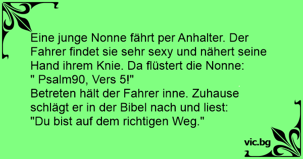 Mladá jeptiška jede stopem. Řidiči auta, které jí zastaví, se strašně líbí a samozřejmě se jí pokouší sbalit. Položí ji ruku na koleno. Jeptiška jenom zašeptá: „Žalm 90 verš 5!“ Šofér svou ruku...