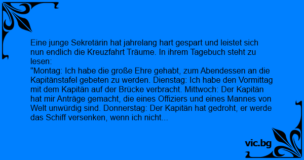 "Montag: Ich habe die große Ehre gehabt, zum Abendessen an die Kapitänstafel gebeten zu werden. Dienstag: Ich habe den Vormittag mit dem Kapitän auf der Brücke verbracht. Mittwoch: Der Kapitän hat mir Anträge gemacht, die eines Offiziers und eines Mannes von Welt unwürdig sind. Donnerstag: Der Kapitän hat gedroht, er werde das Schiff versenken, wenn ich niсhт nachgebe. Freitag: Ich habe eintausend sechshundert Menschenleben gerettet."