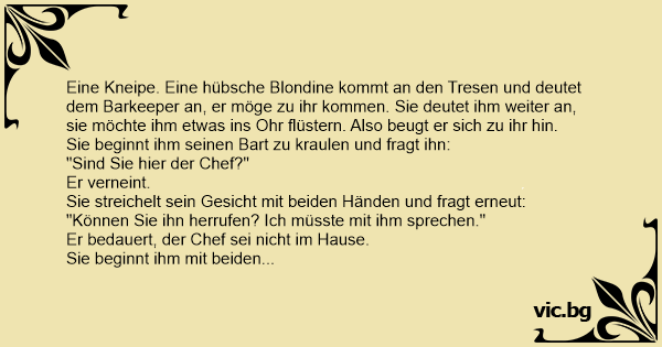 Eine Kneipe. Eine hübsche Blondine kommt an den Tresen und deutet dem Barkeeper an, er möge zu ihr kommen. Sie deutet ihm weiter an, sie möchte ihm etwas ins Ohr flüstern. Also beugt er sich zu ihr hin.