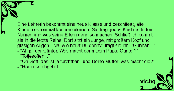 Eine Lehrerin bekommt eine neue Klasse und beschließt, alle Kinder erst einmal kennenzulernen. Sie fragt jedes Kind nach dem Namen und was seine Eltern denn so machen. Schließlich kommt sie in die letzte Reihe. Dort sitzt ein Junge, mit großem Kopf und glasigen Augen. "Na, wie heißt Du denn?" fragt sie ihn. "Günnah..."