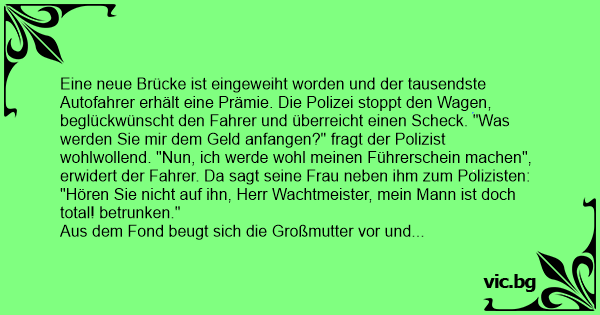 Eine neue Brücke ist eingeweiht worden und der tausendste Autofahrer erhält eine Prämie. Die Polizei stoppt den Wagen, beglückwünscht den Fahrer und überreicht einen Scheck. "Was werden Sie mir dem Geld anfangen?" fragt der Polizist wohlwollend. "Nun, ich werde wohl meinen Führerschein machen", erwidert der Fahrer. Da sagt seine Frau neben ihm zum Polizisten: