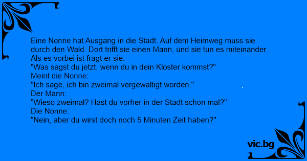 Nonnen var ute og gikk tur i skogen da det plutselig hoppet ut en mann fra buskene og voldtok henne. Mens han holdt på å kle seg spurte han Nonnen om hva hun kommer til å si når hun kommer tilbake...