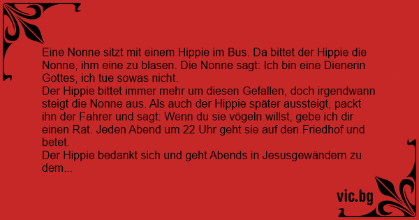 Sitzt eine Nonne im Bus zum Kloster. Steigt nach kurzer Zeit ein Hippie hinzu. Er setzt sich neben die Nonne und fragt sie aus heiterem Himmel: "Hey Süße, willst du mich poppen?" Daraufhin die...