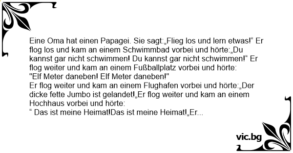 Eine Oma hat einen Papagei. Sie sagt:„Flieg los und lern etwas!“ Er flog los und kam an einem Schwimmbad vorbei und hörte:„Du kannst gar niсhт schwimmen! Du kannst gar niсhт schwimmen!“ Er flog weiter und kam an einem Fußballplatz vorbei und hörte: