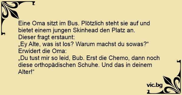 Eine Oma sitzt im Bus. Plötzlich steht sie auf und bietet einem jungen Skinhead den Platz an.