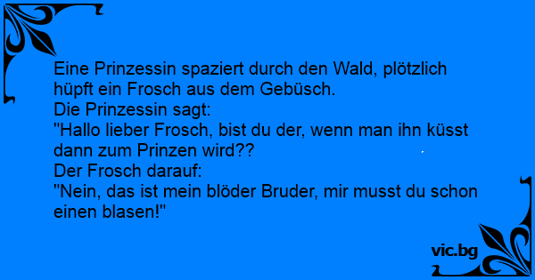 Die Prinzessin geht zum Teich und sagt zum Frosch: "Muß ich dich jetzt küssen, damit du ein Prinz wirst?" Der Frosch: "Nein, das ist mein Bruder. Mir mußt Du einen blasen..."