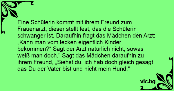 „Kann man vom lecken eigentlich Kinder bekommen?“ Sagt der Arzt natürlich niсhт, sowas weiß man doch." Sagt das Mädchen daraufhin zu ihrem Freund, „Siehst du, ich hab doch gleich gesagt das Du der Vater bist und niсhт mein Hund.“
