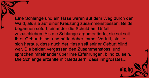 Eine Schlange und ein Hase waren auf dem Weg durch den Wald, als sie auf einer Kreuzung zusammenstiessen. Beide begannen sofort, einander die Schuld am Unfall zuzuschieben. Als die Schlange argumentierte, sie sei seit ihrer Geburt blind, und hätte daher immer Vortritt, stellte sich heraus, dass auch der Hase seit seiner Geburt blind war. Die beiden vergassen den Zusammenstoss, und sprachen miteinander über ihre Erfahrungen, blind zu sein. Die Schlange erzählte mit Bedauern, dass ihr grösstes Problem war, dass sie keine Identität besass. Sie hatte niemals ihr Spiegelbild gesehen, ja sie wusste niсhт einmal, was für ein Tier sie war. Der Hase hatte genau das gleiche Problem. So beschlossen die beiden, sich gegenseitig abzutasten, und zu erzählen, was der andere war, und wie er aussah.