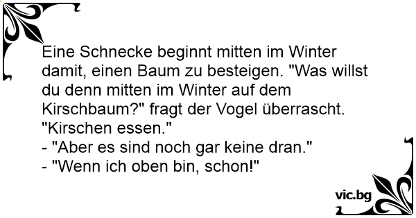 Eine Schnecke kriecht im Winter einen Kirschbaum hoch. Kommt ein Vogel vorbei und fragt: "Was machst Du denn da?" Die Schnecke: "Ich will Kirschen essen." "Aber da hängt doch nichts dran!" sagt da...