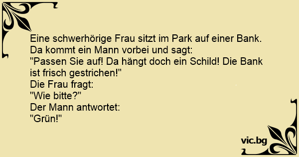 Eine schwerhörige Frau sitzt im Park auf einer Bank. Da kommt ein Mann vorbei und sagt: