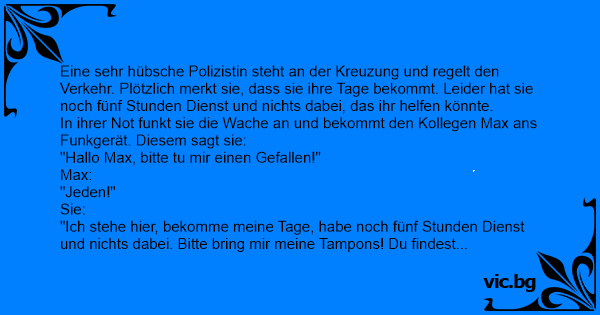 "Ich stehe hier, bekomme meine Tage, habe noch fünf Stunden Dienst und nichts dabei. Bitte bring mir meine Tampons! Du findest sie oben rechts in meinem Schreibtisch. Und, Max - bitte beeile Dich!"