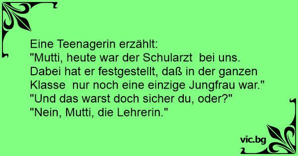 Kommt die 15jährige Tochter aus der Schule und sagt: "Mami, wir sind heute alle untersucht worden. Nur eine ist noch Jungfrau." "Und das bist Du, mein Kind." "Nein, die Lehrerin!"