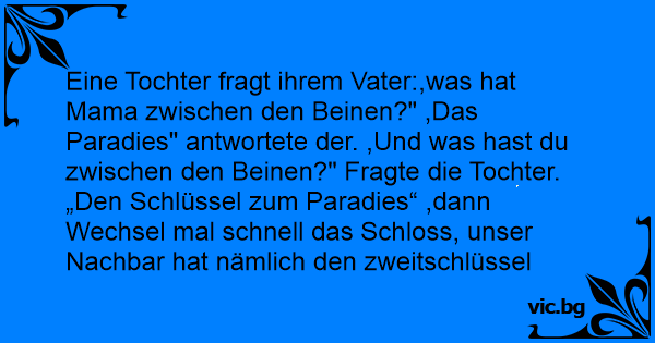 Eine Tochter fragt ihrem Vater:,was hat Mama zwischen den Beinen?" ,Das Paradies" antwortete der. ,Und was hast du zwischen den Beinen?" Fragte die Tochter. „Den Schlüssel zum Paradies“ ,dann Wechsel mal schnell das Schloss, unser Nachbar hat nämlich den zweitschlüssel