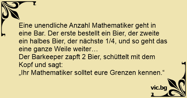 Eine unendliche Anzahl Mathematiker geht in eine Bar. Der erste bestellt ein Bier, der zweite ein halbes Bier, der nächste 1/4, und so geht das eine ganze Weile weiter…