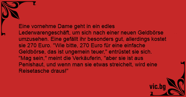 Eine vornehme Dame geht in ein edles Lederwarengeschäft, um sich nach einer neuen Geldbörse umzusehen. Eine gefällt ihr besonders gut, allerdings kostet sie 270 Euro. "Wie bitte, 270 Euro für eine einfache Geldbörse, das ist ungemein teuer," entrüstet sie sich.