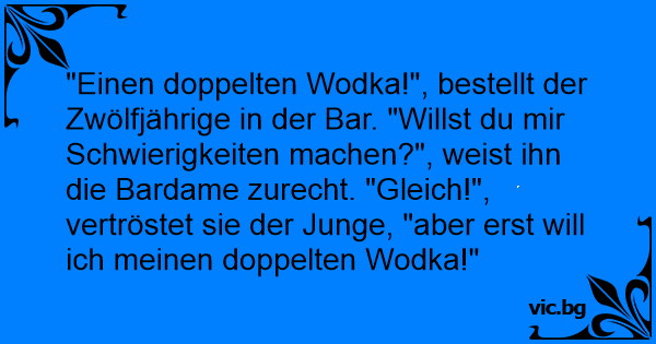 "Einen doppelten Wodka!", bestellt der Zwölfjährige in der Bar. "Willst du mir Schwierigkeiten machen?", weist ihn die Bardame zurecht. "Gleich!", vertröstet sie der Junge, "aber erst will ich meinen doppelten Wodka!"