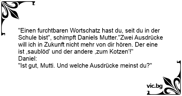 "Einen furchtbaren Wortschatz hast du, seit du in der Schule bist", schimpft Daniels Mutter."Zwei Ausdrücke will ich in Zukunft niсhт mehr von dir hören. Der eine ist ,saublöd' und der andere ,zum Kotzen'!"