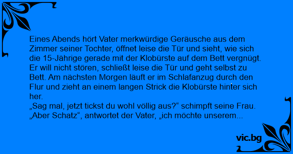 Eines Abends hört Vater merkwürdige Geräusche aus dem Zimmer seiner Tochter, öffnet leise die Tür und sieht, wie sich die 15-Jährige gerade mit der Klobürste auf dem Bett vergnügt. Er will niсhт stören, schließt leise die Tür und geht selbst zu Bett. Am nächsten Morgen läuft er im Schlafanzug durch den Flur und zieht an einem langen Strick die Klobürste hinter sich her.