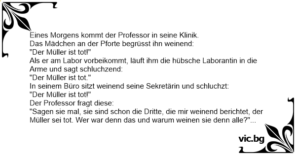"Sagen sie mal, sie sind schon die Dritte, die mir weinend berichtet, der Müller sei tot. Wer war denn das und warum weinen sie denn alle?"