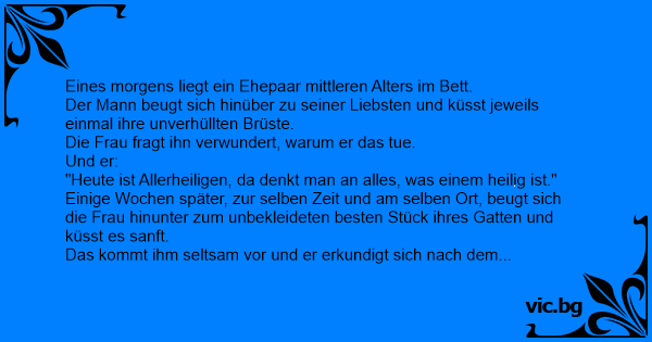 Einige Wochen später, zur selben Zeit und am selben Ort, beugt sich die Frau hinunter zum unbekleideten besten Stück ihres Gatten und küsst es sanft.
