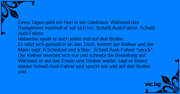 Er setzt sich gemütlich an den Tisch, kommt der Kellner und der Mann sagt: A Schnitzel und a Bier, Scheiß Audi-Fahrer *spuck*. Der Kellner wundert sich nur und schreibt die Bestellung auf.