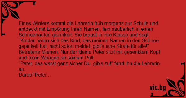Eines Winters kommt die Lehrerin früh morgens zur Schule und entdeckt mit Empörung Ihren Namen, fein säuberlich in einen Schneehaufen gepinkelt. Sie braust in ihre Klasse und sagt: