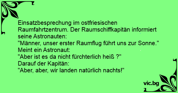 Ein Russe, ein Amerikaner und ein Österreicher sitzen zusammen und diskutieren über die Raumfahrt. Da fängt der Russe an: "Natürlich sind wir die Weltraumnation Nummer eins! Denn wir haben den ersten Menschen ins All gebracht!" Darauf der Amerikaner: "No no! Wir sind in Sachen Weltall the number...