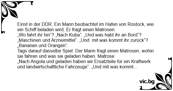 „Wo fahrt ihr hin“? „Nach Kuba“. „Und was habt ihr an Bord“? „Maschinen und Arzneimittel“. „Und mit was kommt ihr zurück“? „Bananen und Orangen“.