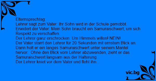 Der Vater starrt den Lehrer für 20 Sekunden mit ernstem Blick an. Dann holt er ein langes Samuraischwert unter seinem Mantel hervor. Ohne den Blick vom Lehrer abzuwenden, zieht er das Samuraischwert langsam aus der Halterung.