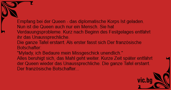 Alles beruhigt sich, das Mahl geht weiter. Kurze Zeit später entfährt der Queen wieder das Unaussprechliche. Die ganze Tafel erstarrt.