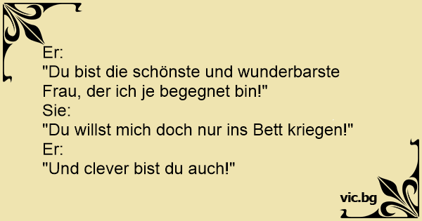 Er: "Du bist die süßeste und schönste Frau, die ich in meinem ganzen Leben getroffen habe!" Sie: "Ach komm, du willst mich doch nur poppen!" Er: "Und klug bist du auch!"