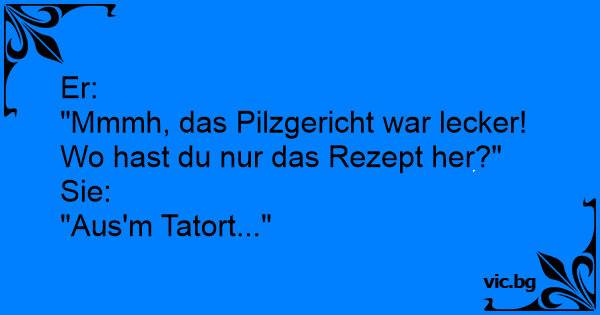 Der Ehemann isst mit Genuß das Pilzgericht: "Schatz, woher hast du das tolle Rezept?" "Aus einem Krimi!"