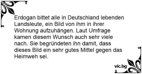 Erdogan bittet alle in Deutschland lebenden Landsleute, ein Bild von ihm in ihrer Wohnung aufzuhängen. Laut Umfrage kamen diesem Wunsch auch sehr viele nach. Sie begründeten ihn damit, dass dieses Bild ein sehr gutes Mittel gegen das Heimweh sei.