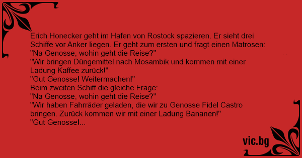 Erich Honecker geht im Hafen von Rostock spazieren. Er sieht drei Schiffe vor Anker liegen. Er geht zum ersten und fragt einen Matrosen: