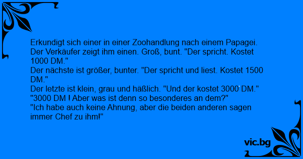Ein Mann betritt eine Tierhandlung, um einen Papagei zu kaufen. Der Verkäufer zeigt die drei vorrätigen Exemplare. Der erste Papagei ist herrlich bunt, bildschön und 50 cm gross. "Na ja", denkt der Käufer, der wird wohl recht teuer sein. Er fragt den Verkäufer nach dem Preis: "1.000 Euro! Aber...
