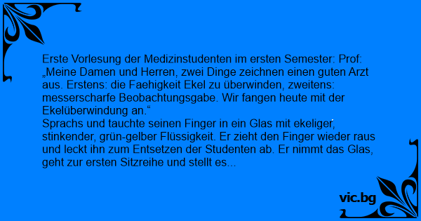 Sprachs und tauchte seinen Finger in ein Glas mit ekeliger, stinkender, grün-gelber Flüssigkeit. Er zieht den Finger wieder raus und leckt ihn zum Entsetzen der Studenten ab. Er nimmt das Glas, geht zur ersten Sitzreihe und stellt es vor einem Stundenten auf den Tisch… Der ziert sich eine Weile, taucht aber dann doch schliesslich seinen Finger in das Glas und leckt ihn ab. Meint der Prof: