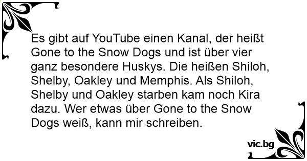 Es gibt auf YouTube einen Kanal, der heißt Gone to the Snow Dogs und ist über vier ganz besondere Huskys. Die heißen Shiloh, Shelby, Oakley und Memphis. Als Shiloh, Shelby und Oakley starben kam noch Kira dazu. Wer etwas über Gone to the Snow Dogs weiß, kann mir schreiben.