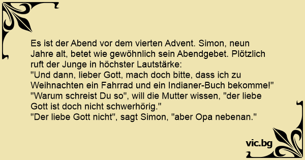 Es ist der Abend vor dem vierten Advent. Simon, neun Jahre alt, betet wie gewöhnlich sein Abendgebet. Plötzlich ruft der Junge in höchster Lautstärke: