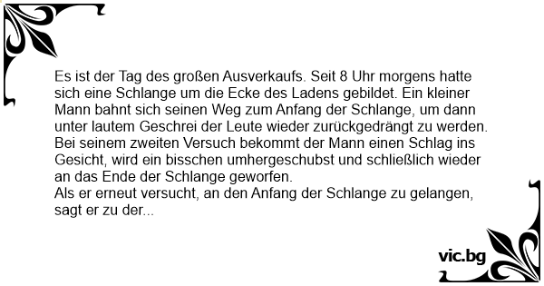 Es ist der Tag des großen Ausverkaufs. Seit 8 Uhr morgens hatte sich eine Schlange um die Ecke des Ladens gebildet. Ein kleiner Mann bahnt sich seinen Weg zum Anfang der Schlange, um dann unter lautem Geschrei der Leute wieder zurückgedrängt zu werden.