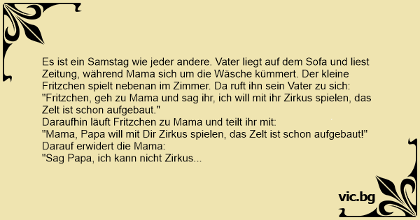"Fritzchen, geh zu Mama und sag ihr, ich will mit ihr Zirkus spielen, das Zelt ist schon aufgebaut."