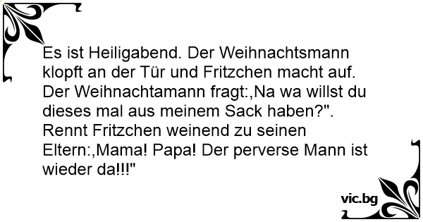 Es ist Heiligabend. Der Weihnachtsmann klopft an der Tür und Fritzchen macht auf. Der Weihnachtamann fragt:,Na wa willst du dieses mal aus meinem Sack haben?". Rennt Fritzchen weinend zu seinen Eltern:,Mama! Papa! Der perverse Mann ist wieder da!!!"