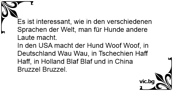 In den USA macht der Hund Woof Woof, in Deutschland Wau Wau, in Tschechien Haff Haff, in Holland Blaf Blaf und in China Bruzzel Bruzzel.