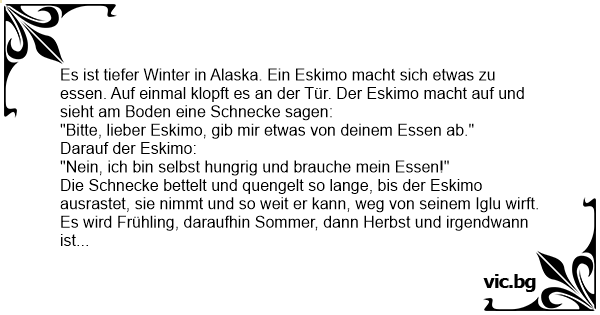Es ist tiefer Winter in Alaska. Ein Eskimo macht sich etwas zu essen. Auf einmal klopft es an der Tür. Der Eskimo macht auf und sieht am Boden eine Schnecke sagen: