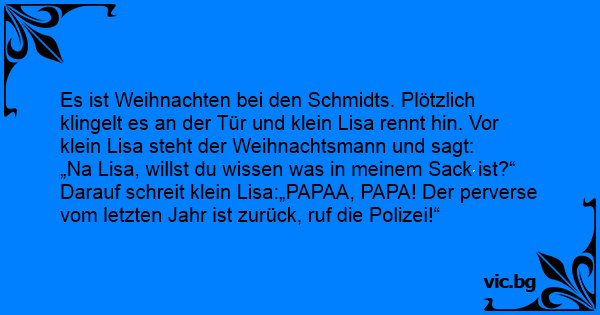 Es ist Weihnachten bei den Schmidts. Plötzlich klingelt es an der Tür und klein Lisa rennt hin. Vor klein Lisa steht der Weihnachtsmann und sagt: