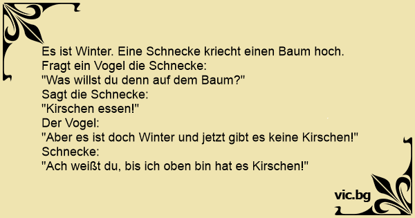 Eine Schnecke kriecht im Winter einen Kirschbaum hoch. Kommt ein Vogel vorbei und fragt: "Was machst Du denn da?" Die Schnecke: "Ich will Kirschen essen." "Aber da hängt doch nichts dran!" sagt da...