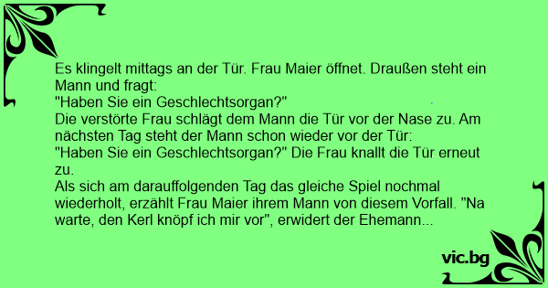 Als sich am darauffolgenden Tag das gleiche Spiel nochmal wiederholt, erzählt Frau Maier ihrem Mann von diesem Vorfall. "Na warte, den Kerl knöpf ich mir vor", erwidert der Ehemann wütend. "Morgen werde ich mich hinter der Tür verstecken und wenn der dich dann blöd anmacht, gibt's Saures."